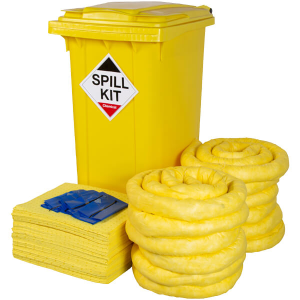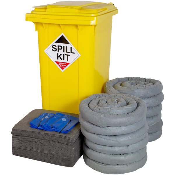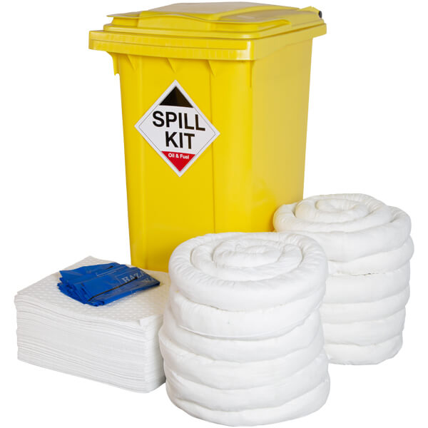 Ensuring full compliance with EA/SEPA/NIEA guidelines (PPG26), the 240 litre wheeled spill kit is easily portable and has a high capacity. This makes it perfect for where potentially large volumes of liquid present a spill risk. Enabling you to quickly clean up any spills or leaks, the kit helps to protect the environment while preventing any contamination within the workplace. Different options are available to choose from, with each of them offering protection against a range of potential hazards. Each large wheelie bin contains everything you will need to efficiently clean up to 240 litres of liquid. Featuring a large identification sign which is easy to spot, the large yellow wheelie bin also comes in blue to suit the oil and fuel kit for the construction industry. Manufactured in the UK by Fentex, the 240 litre wheeled spill kit features a total of 11 absorbent socks which allows you to contain the spillage to one location. 100 absorbent pads soak up any liquid, while the four included disposable bags and ties ensure that you can segregate waste before disposing of it safely and responsibly. It is worth considering an anti-tamper seal to prevent any potential misuse. Suitable for commercial and industrial premises with bulk liquid storage, ensure everyone on site knows where to find the high capacity 240 litre wheeled spill kit, as well as how to use it in an emergency. Often required by law when storing or using potentially-hazardous materials, the 240 litre wheeled spill kit is designed to make the job of cleaning up much easier. Which Spill Kit Do I Need?Selecting the correct spill kit for the application they will be used for is absolutely essential. This ensures that they will be effective in the event they need to be used, and you will know if you’ll require multiple kits. Universal and environmentally-friendly, the EVO spill kit can be used in the vast majority of situations. This is made of recycled cotton fibres which are 25% more absorbent than standard pads, while benefiting from an ultra-low carbon footprint. It is suitable for multiple purposes, including the absorption of hydraulic oil, engine oil, solvents, lubricating oil, coolant, and antifreeze. If you are looking for the perfect solution for absorbing oil, water, coolant, antifreeze, weak chemicals, and solvents, then the general-purpose spill kit is the ideal choice. For absorbing engine oil, hydraulic oil, lubricating oil, the oil and fuel spill kit provides the ideal solution. It can even be used on the water in rivers and marinas as it doesn’t absorb water. The chemical spill kit is specially designed for absorbing acids, alkalis, solvents, and strong chemicals in a safe manner. Although, please note that it is not suitable for use on oxidisers. |