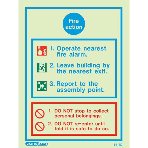Our Fire Action 5414 Sign may look like a very simple sign, but it contains all the necessary information on what people should do in the event a fire emergency breaks out in a building. First, they should raise the fire alarm, then head towards the nearest exit so they can leave the building. Upon leaving the building, they should report to the assembly point. This sign also warns them from pausing during evacuation to gather their personal belongings, and that they should stay away from the building, not re-entering it until fire marshals declare the fire out. This life-saving sign has two sizes: D and DD, which measure 200mm x 150mm and 300mm x 225mm, respectively. The high quality rigid plastic material Jalite used in our Fire Action 5414 Sign means that it is very tough and durable, and it will last for a very long time.