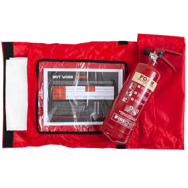 The Hot Work Kit ensures you have everything you need ready to undertake Hot Work safely, and rolls up into an easy to store and carry bag. First of its kind, the all-in-one kit has been specially developed for contractors who work on sites welding, soldering, brazing, grinding and drilling. Choose between a 2kg ABC Powder fire extinguisher or 2 litre Foam fire extinguisher, a 1.2 x 1.8m high-performance industrial fire blanket, and a plastic pocket for storing permit forms. This is then all stored in a red roll-up bag to prevent extinguisher damage and to ensure you’re always prepared with easy-carry handles. With the extinguisher and fire blanket compliant with relevant British Standards so you can handle heat, sparks and flames. Everyone must assess the fire risks in a work area, obtain or self-complete a Hot Work permit for every job before starting work, and ensure that the necessary fire safety equipment is on site in case of an incident. Welding, soldering, brazing, grinding and drilling are known as ‘Hot Work’, posing fire risks especially in areas containing flammable or combustible materials. |