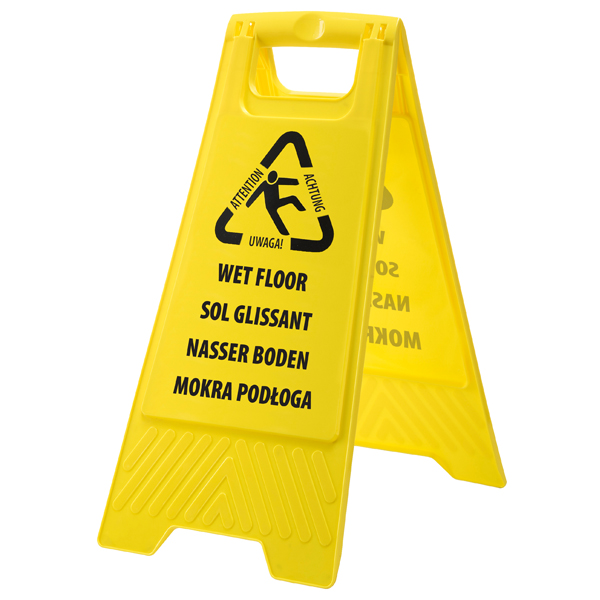 Helping to prevent slips, trips, and falls in workplaces and public spaces, the multi-language wet floor warning sign is a simple and low-cost solution for alerting employees and visitors to any potential hazards. Its highly visible bright yellow design ensures that it can be seen easily, and it is suitable for use during wet weather, alerting anyone of spillages, and when cleaning floors. A fold flat and lightweight design allows for convenient storage, with a built-in carry handle ensuring easy transportation. Suitable for most environments, the sign is made from durable plastic and features black text and a universally-recognisable symbol – ensuring that the wet floor sign can be easily seen, read, and understood. Each side of the wet floor warning sign provides a warning message in English, German, French, and Polish so that everyone is made fully aware of any temporary hazards. |